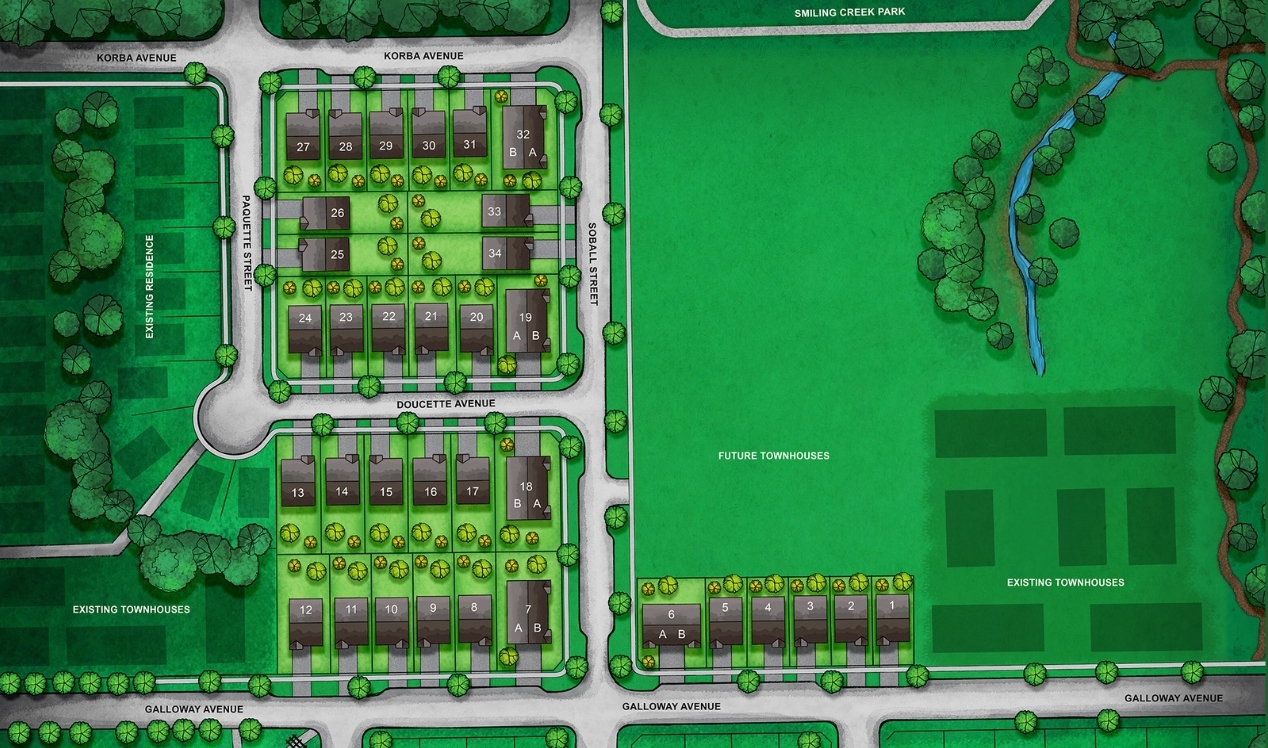 Situated near Galloway Park and a short walk from Smiling Creek Elementary School. The location offers convenience and the perfect balance of beauty and tranquility. From peaceful morning strolls through nature to evenings spent watching the sun set over the park.